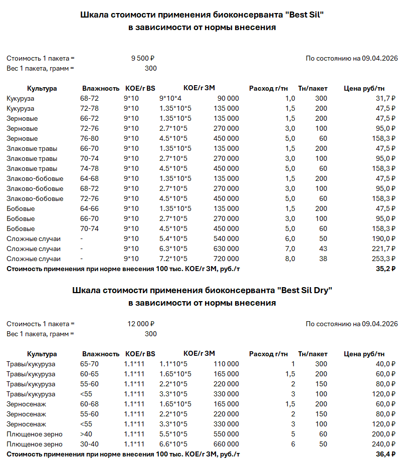 Стоимость применения биоконсервантов "Best Sil" в зависимости от нормы внесения