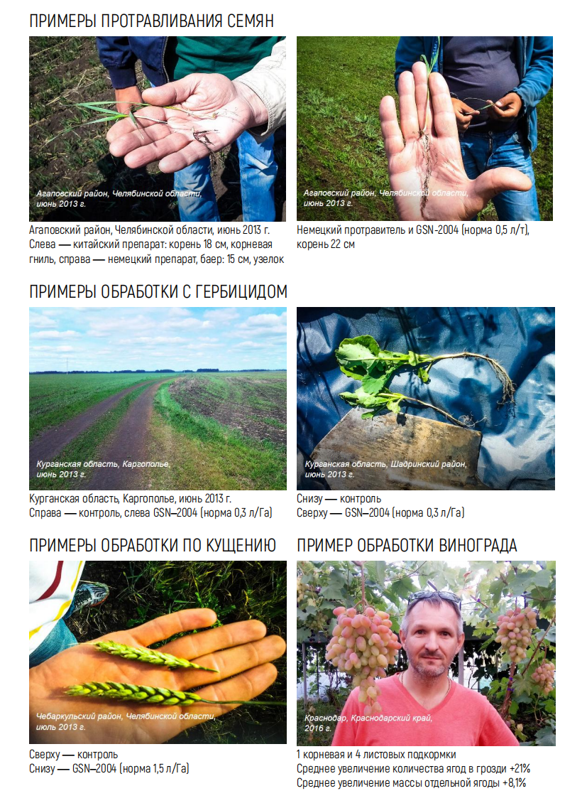 Препарат действует на уровне мембраны растительной клетки. В зависимости от дозы и фазы развития растения обработка GSN-2004 дает различные эффекты.