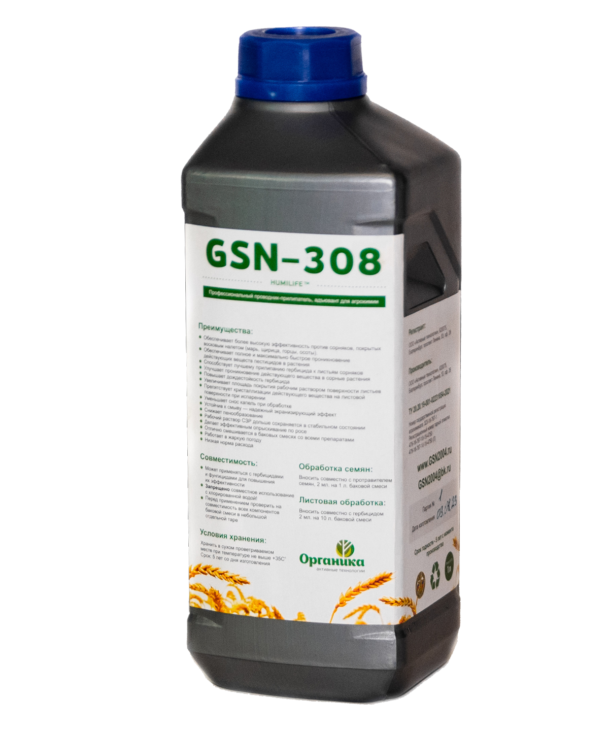 При использовании GSN-308 с фунгицидами и инсектицидами наблюдается максимальное обволакивание листа пленкой GSN-308, которая оберегает от большинства мошек и насекомых, а также увеличение срока службы агрохимии на растении по времени.