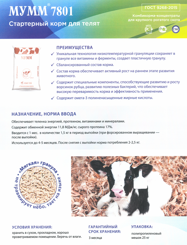 Гранулированный стартерный комбикорм-концентрат. Содержание СП 17%, ОЭ 11,5 МДж/кг. Обеспечивает активный рост и развитие телят. Вводится с 1,5-2-х месячного возраста в количестве 1,5 кг в период выпойки. Используется до 4-5 месяцев. После снятия с выпойки норма потребления 2-2,5 кг. Обеспечивает теленка протеином, энергией, витаминами, минералами. Содержит лекарственное средство: Флавофосфолипол 8% - 140 г/т.